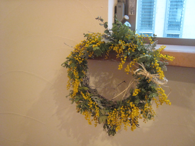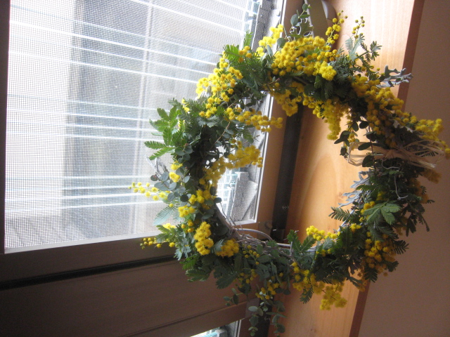 今年もフレッシュでミモザとユーカリとしろたえぎく ( 白妙菊、ダスティ ミラー )を