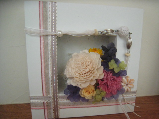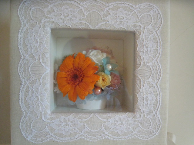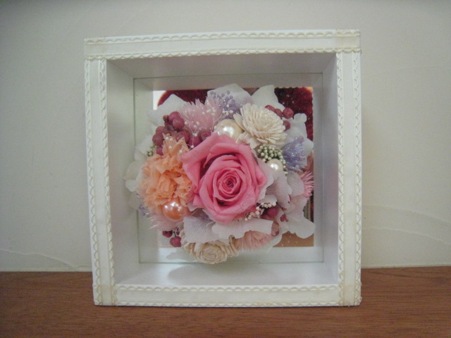 こんな感じで製作進んでいます。ミラーの額を使ってラウンドにアレンジやさしい色合いです